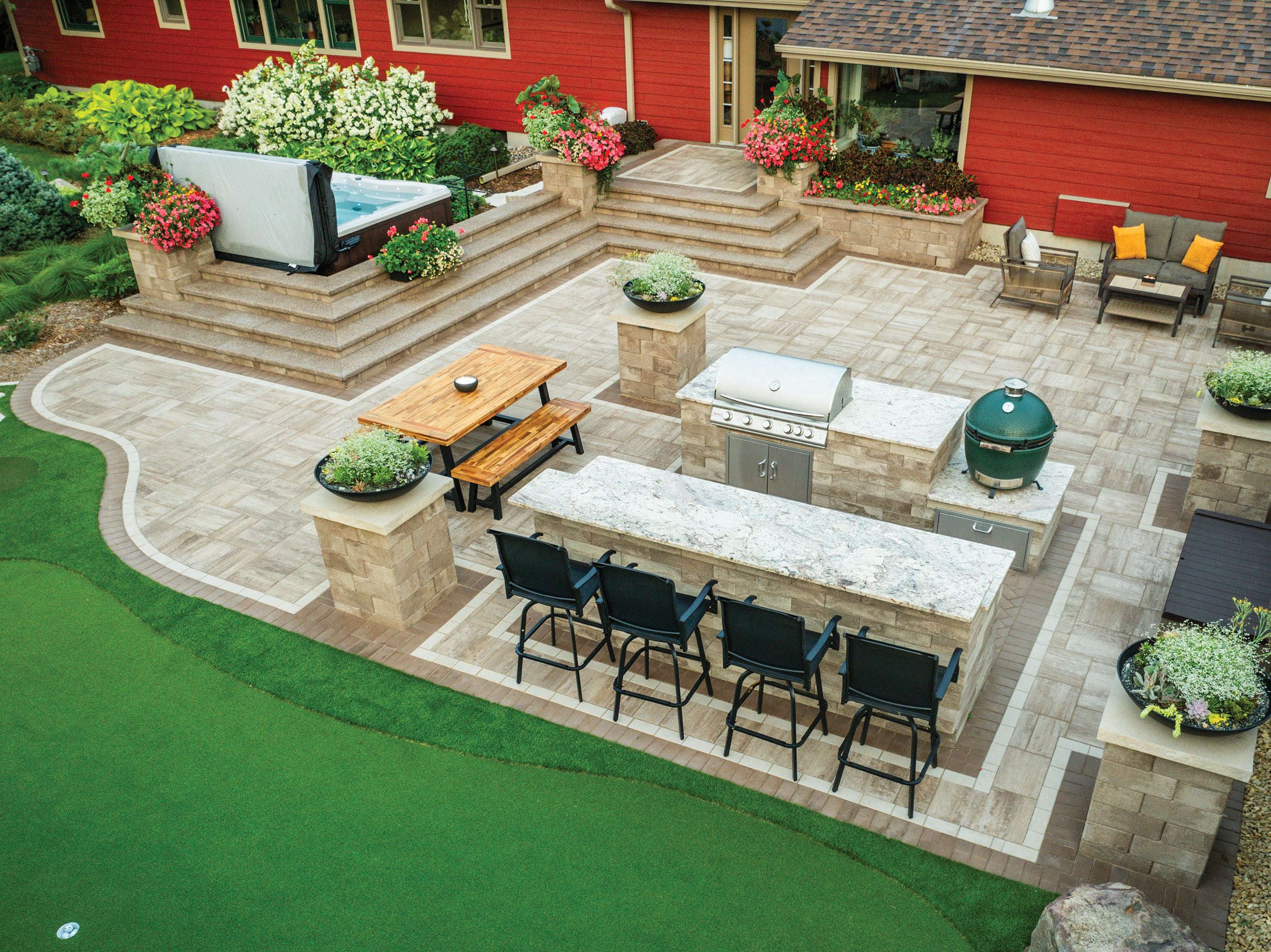For that lived-in feel from day one, use warm earthy tones and rough textures. Foster intimacy and comfort with smaller pavers in traditional laying patterns. Add high-contrast borders and wall caps to define rustic edges.