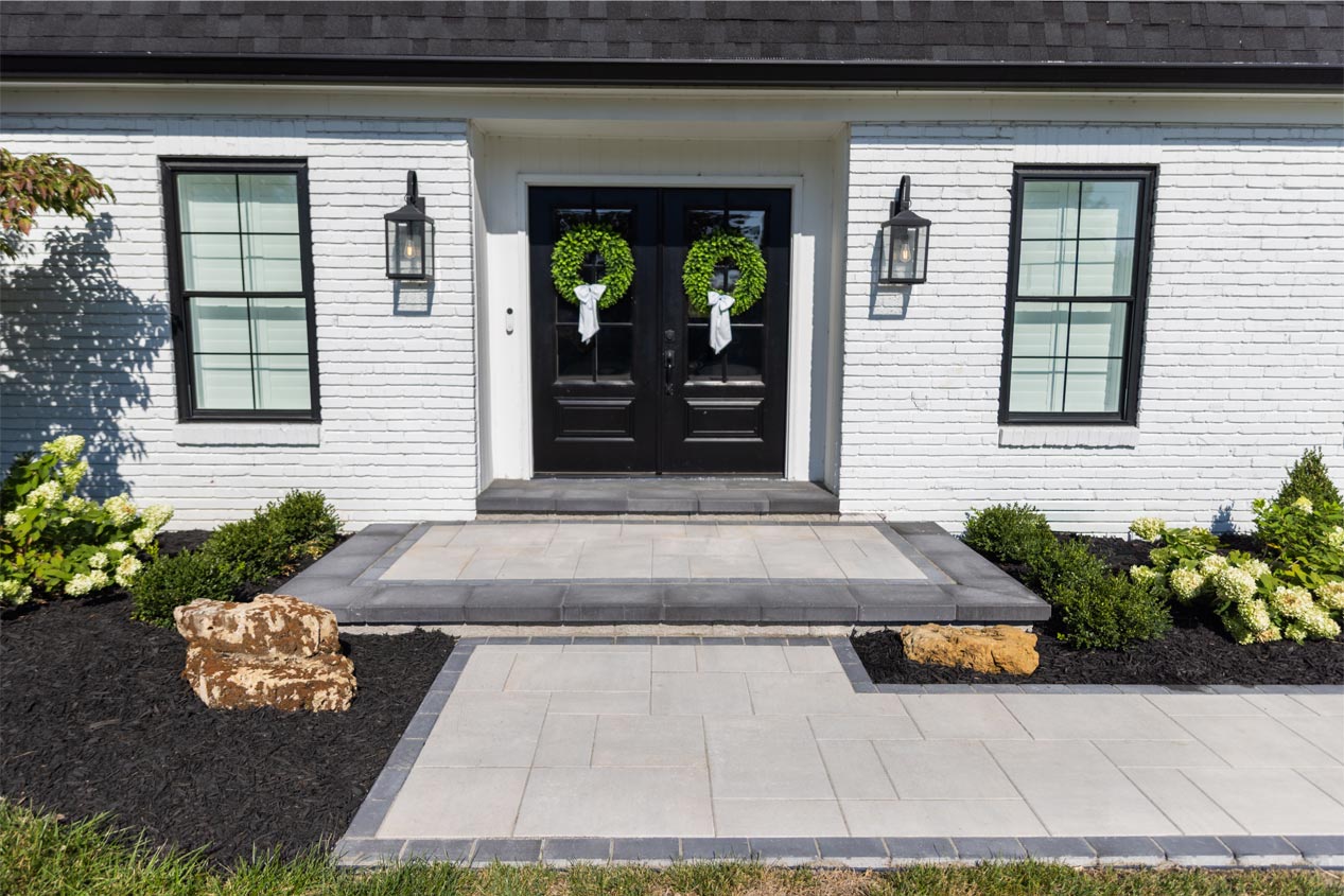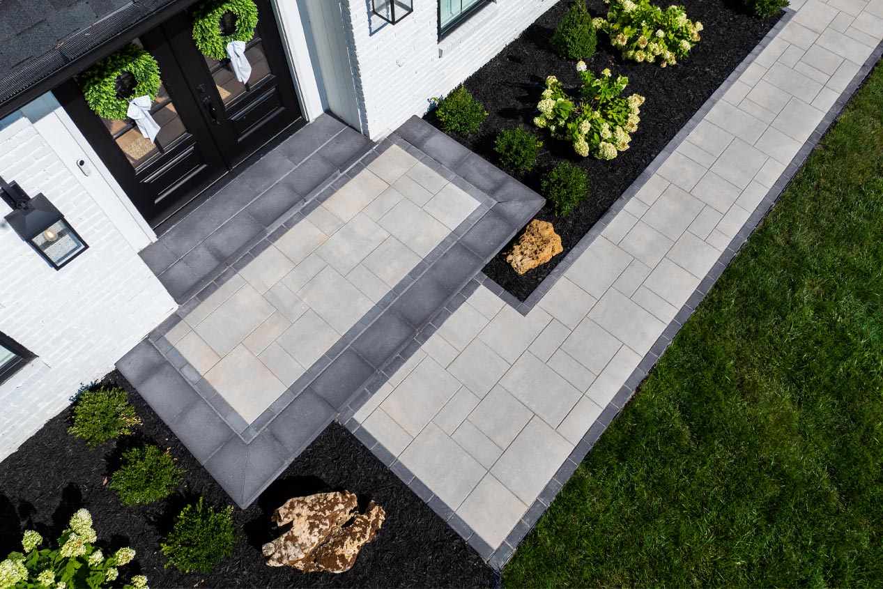 The walkway features clean lines, with Grand DISCOVER PAVERS® in Allure laid in a three-piece slab design surrounded by a simple border of 4x8 ELEMENTSTM PAVERS in Reflection. An expansive landing bordered by Double Sided Smooth Rectangle Caps in Reflection connects the front door to the walkway, providing ample space for container plants or seasonal decorations without crowding visitors.