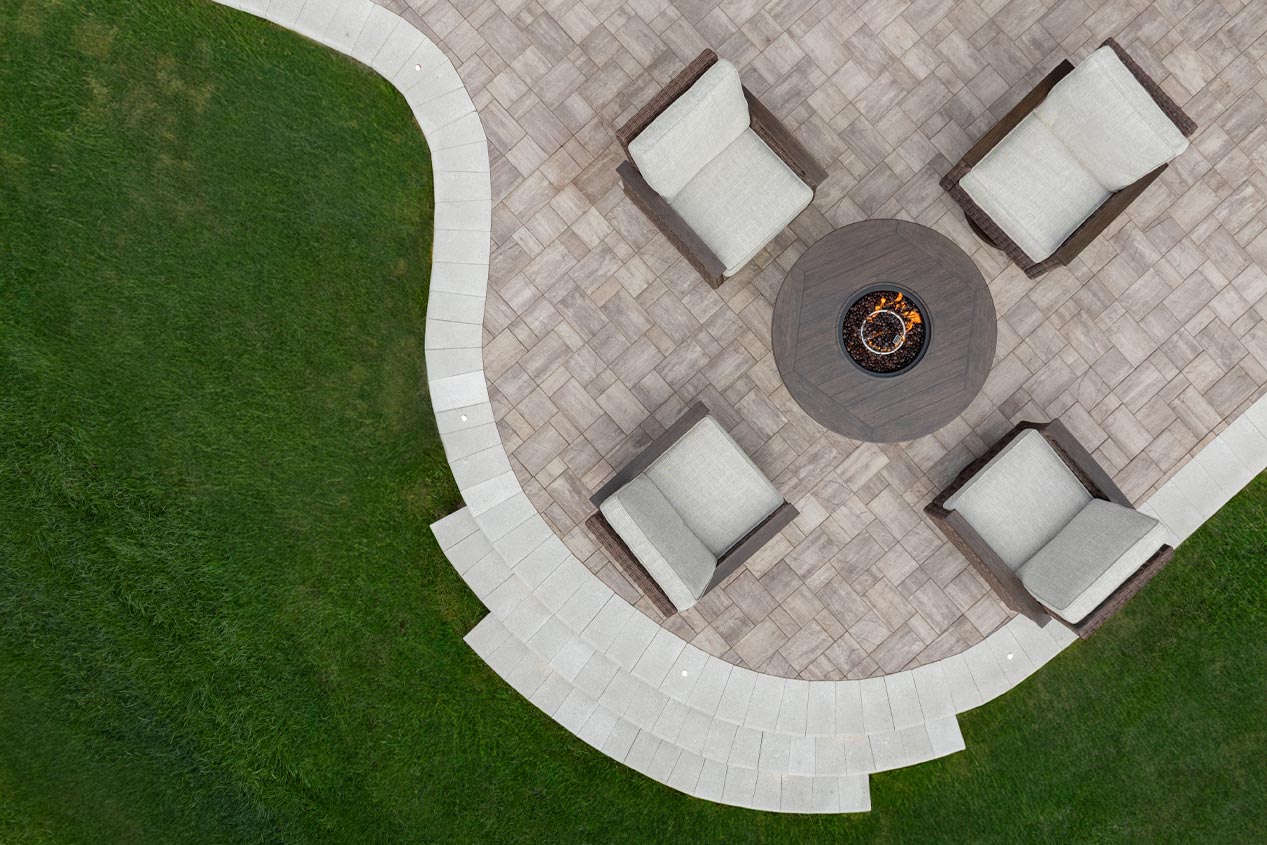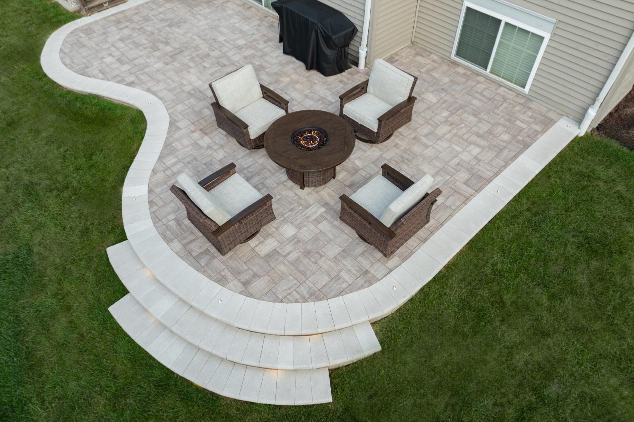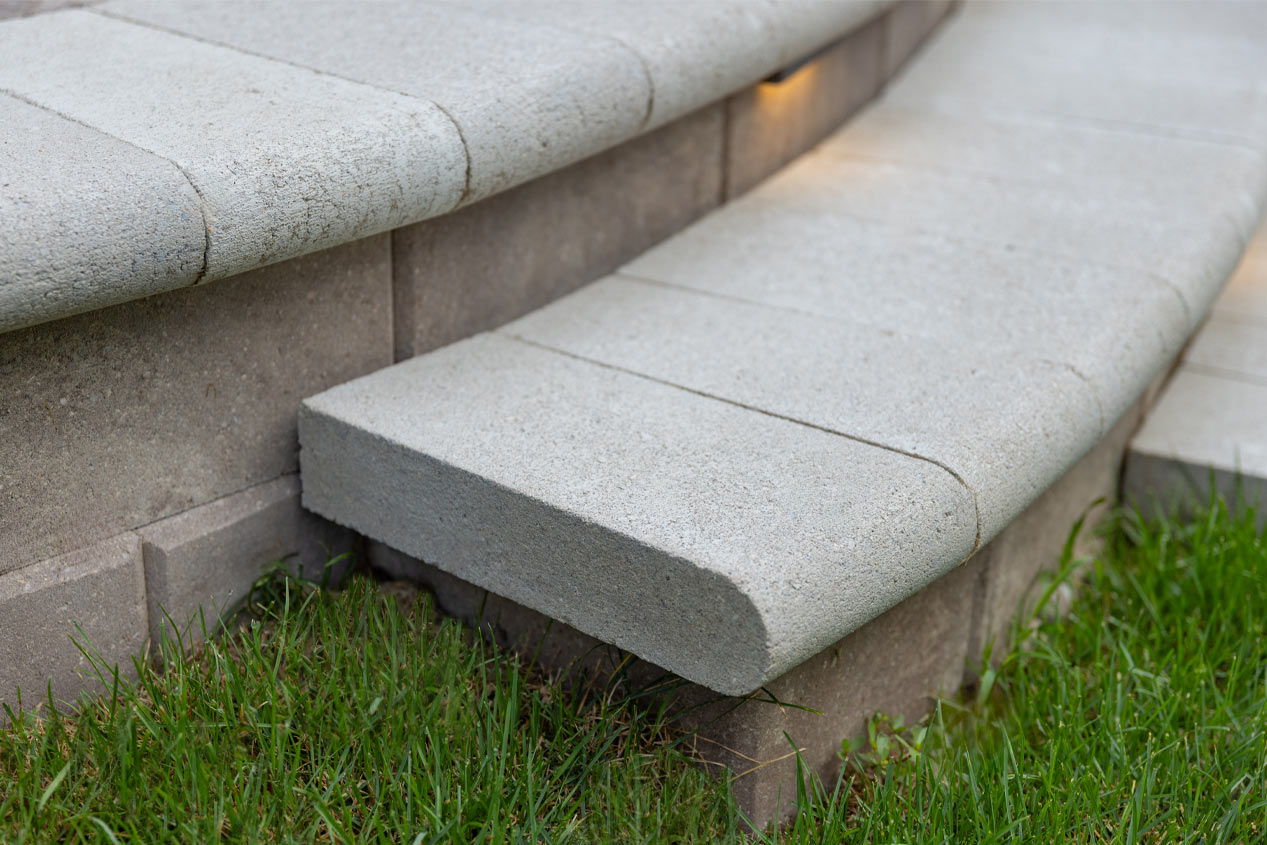 The versatility of concrete landscape products makes them a great solution for sites with challenging slopes. This backyard patio in Crystal Lake, Ill., uses coordinating retaining wall units and concrete pavers to expand the usable area immediately behind the house. The homeowners chose VANTAGE PAVERS® in Enlighten for the patio surface, with Smooth TRIBUTE® WALL SYSTEMS in the same color for a short retaining wall and curved staircase on one end of the patio. The retaining wall creates additional surface area, providing space for a comfortable outdoor living area centered around a fire feature.