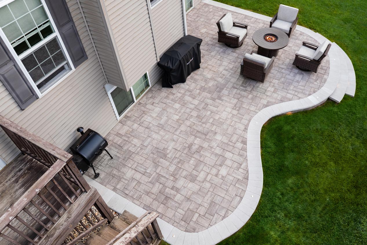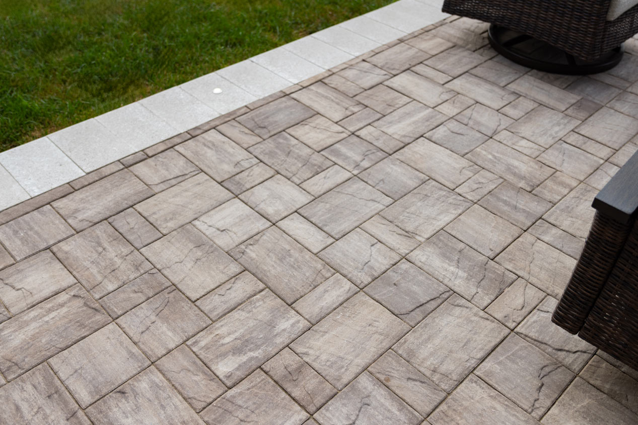 The finished patio features a gently curved border made with Grand CRESTTM COPING PAVERS in Vision. The same coping pavers also form a staircase at the point where the elevation change between the patio and yard is the greatest. The simple design and use of light shades and warm blended colors complements the home’s traditional aesthetic.