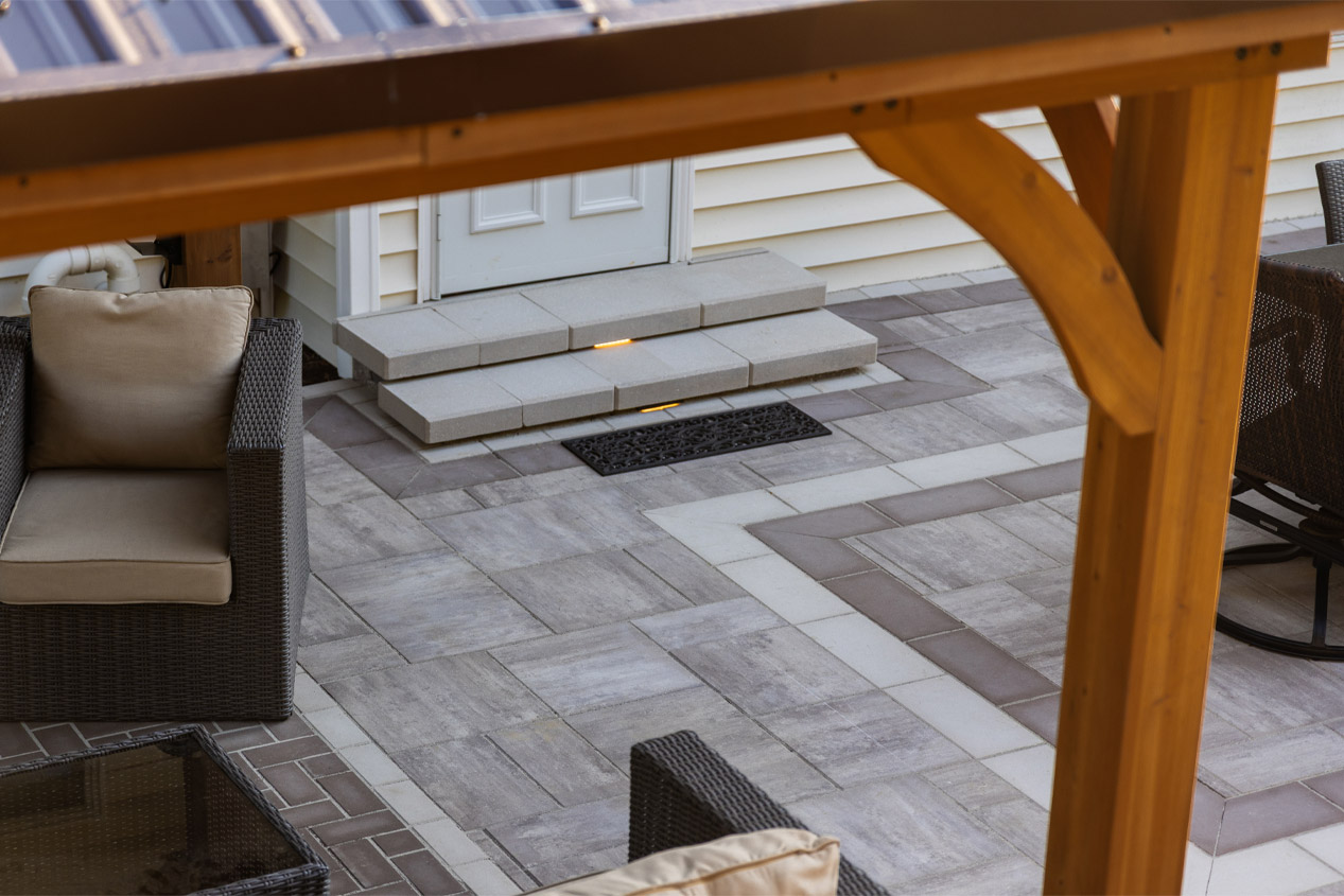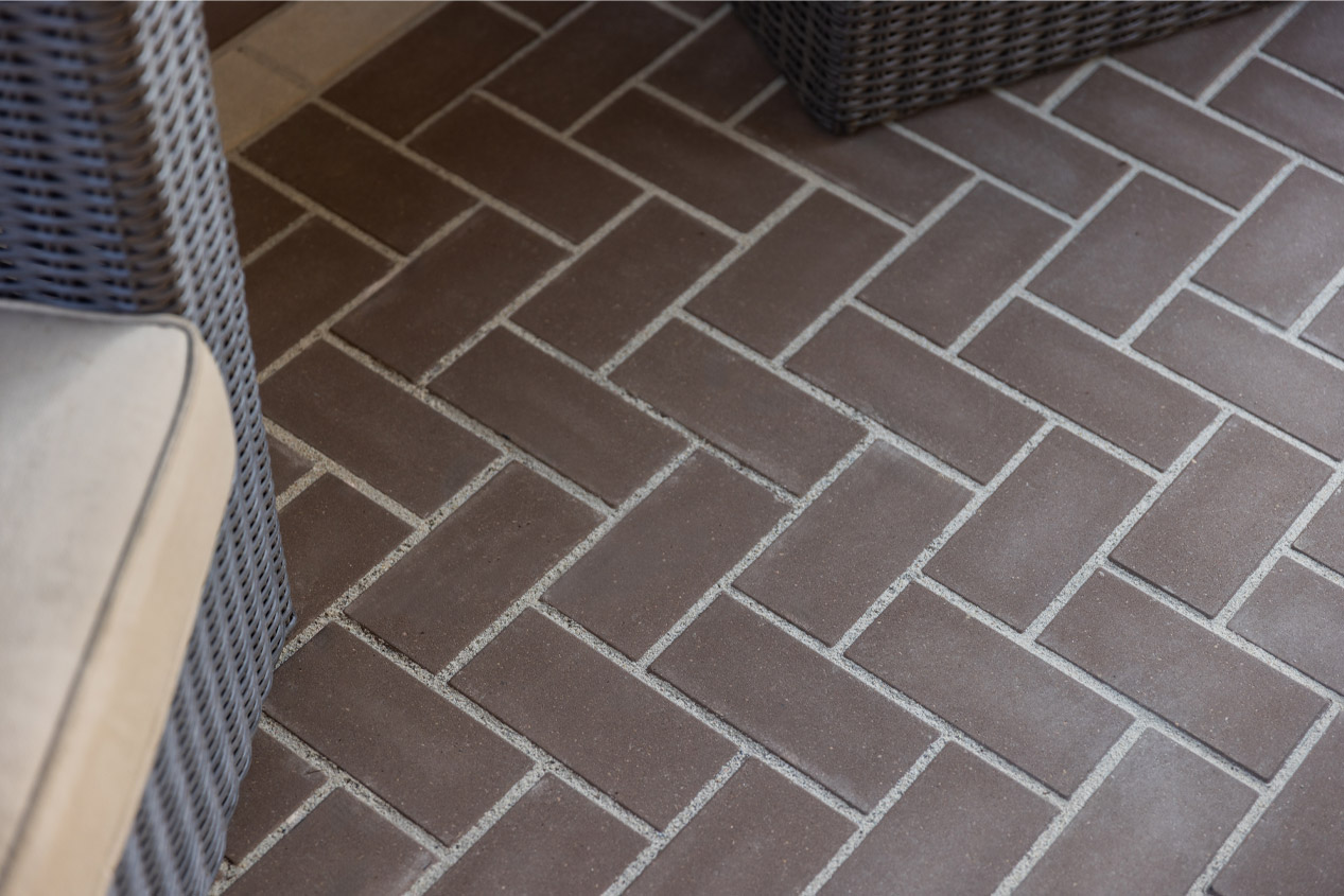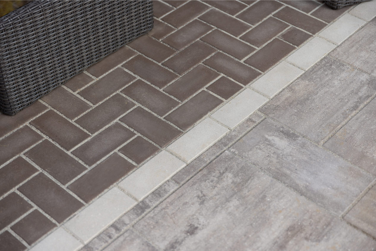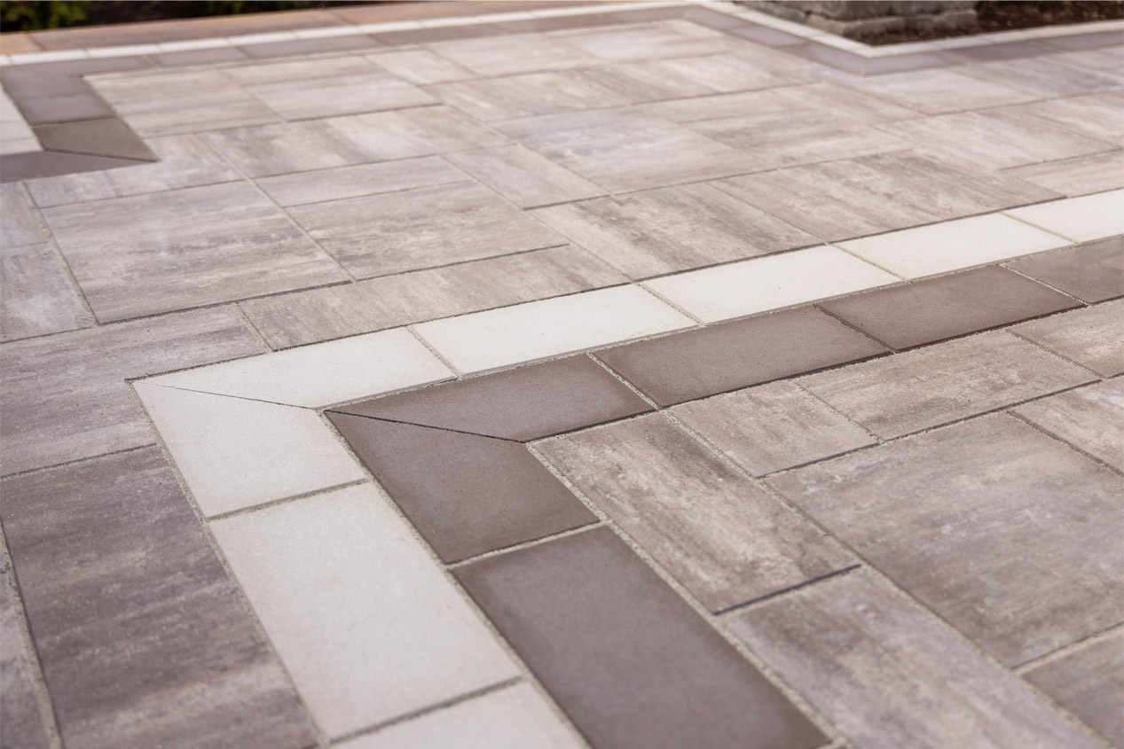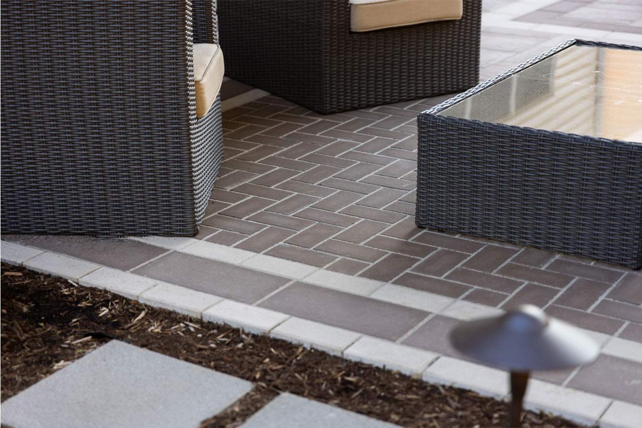 The patio includes an intimate gathering area with comfortable seating as well as a dining area. Underneath each space, the paver pattern functions like an area rug, defining the space and lending a custom, handcrafted feel to the overall design. In the seating area, 4x8 ELEMENTSTM PAVERS in Beckon were installed in a herringbone pattern with a three-layer border made from 8x16 ELEMENTSTM PAVERS in Beckon and 4x8 ELEMENTS PAVERS in Vision.
